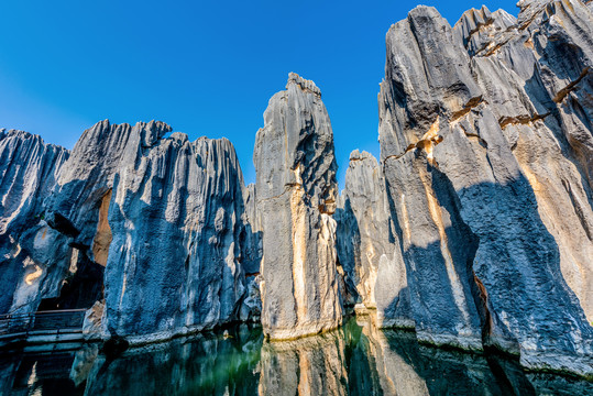 云南石林风景区,云南石林,天下第一奇观,也是阿诗玛的故乡,约3亿年前是一片汪洋大海,昆明石林风景区为纯灰岩剑状喀斯特的典型集中区,岩石主体是呈浅灰色的纯灰岩及茅口组白云质灰岩,大石林、小石林、步哨山、李子园箐和万年灵芝五个片区内分布着剑状、柱状、塔状、蘑菇状、平衡状及不规则状的各种石峰。其中,步哨山为石林景区海拔最高处,区内多柱状石林;景点中有海洋生物化石,记录着2.7亿年前石林地区生机勃发的海底世界。