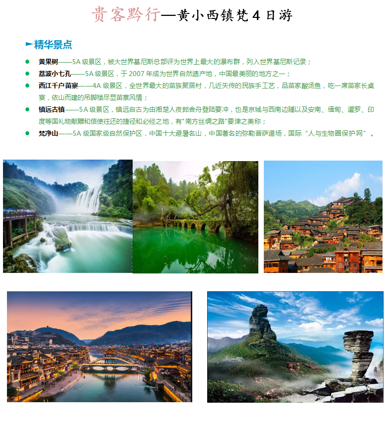 早上统一集合乘车出发(具体集合时间地点以导游提前一天通知的为准,导游会提前一天晚上21:00之前联系客人,请保持手机畅通,含接的游客师傅会在前一天晚上21:30左右联系)前往黄果树风景名胜景区(车程约2.5小时);换乘景区环保车(不含黄果树观光车50元/人、景区保险10元/人,客人共自理60元/人,单程扶梯29元/人,客人需要自理89元/人),游览瀑布群最宽的【陡坡塘瀑布】(游览时间约1小时);相对大瀑布的雄伟壮阔,她显得小而精致,因在80版《西游记》中出现而闻名(唐增师徒牵马过河的取景之地)。中餐后游览有水上石林、天然盆景之称的【天星桥景区】 (游览时间约1.5小时);这里石与水相融一体,脚踏在石上,人行在水中,小桥流水,曲径通幽,山石不高,清流不深,在石缝中穿行,就像儿时捉迷藏;天星桥注明景点(天星桥桥上桥 西游记小白龙冒水之地 银链坠潭瀑布 出口可以选择乘坐天星桥索道(天星桥索道不含10元/人自愿消费)或者步行出景区(特别备注;天星桥景区保证走下半段,除景区关闭以外),最后一站游览【黄果树大瀑布】(游览时间约2小时);黄果树大瀑布宽101米,高77.8米是世界上唯一可以从上、下、前、后、左、右六个方位观赏的瀑布,通过从瀑布后自然贯通的水帘洞能从洞内外听、观、摸瀑布。之后返回贵阳入住酒店(车程约2.5小时)。